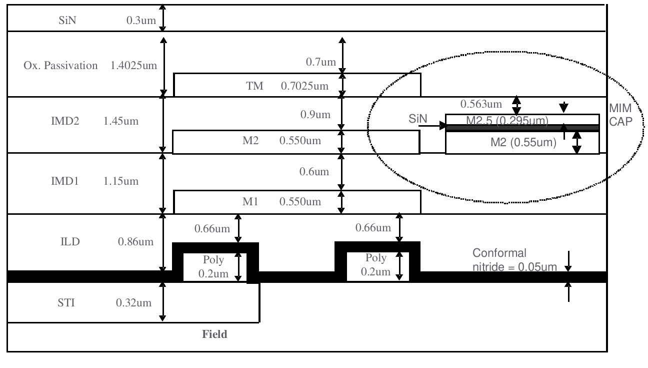 3.2 1P3M (TM 6KA with MIM) Structure¶ MIM was placed in between Metal2 and Metal3 (Top Metal); SIN=0.042um for 1.5fF, SIN=0.062um for 1.0fF