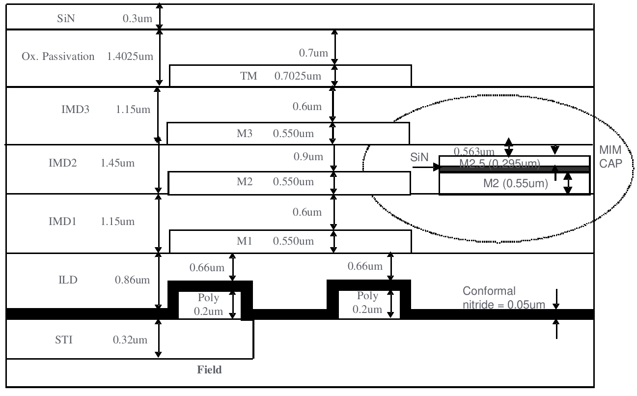 3.6 1P4M (TM 6KA with MIM) Structure¶ MIM was placed in between Metal2 and Metal3; SIN=0.042um for 1.5fF, SIN=0.062um for 1.0fF