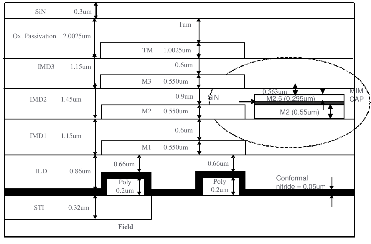 3.8 1P4M (TM 9KA with MIM) Structure¶ MIM was placed in between Metal2 and Metal3; SIN=0.042um for 1.5fF, SIN=0.062um for 1.0fF
