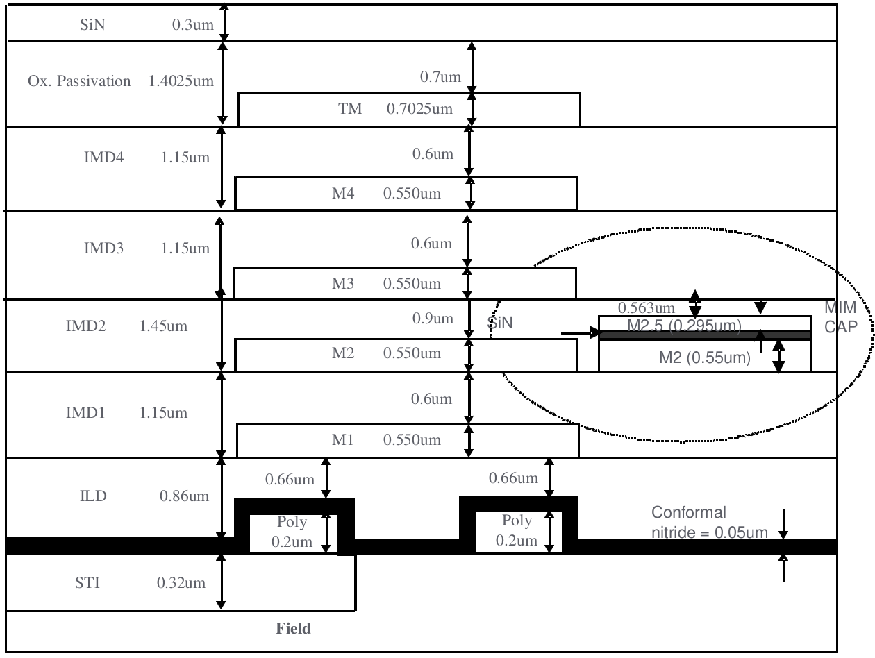 3.10 1P5M (TM 6KA with MIM) Structure¶ MIM was placed in between Metal2 and Metal3; SIN=0.042um for 1.5fF, SIN=0.062um for 1.0fF