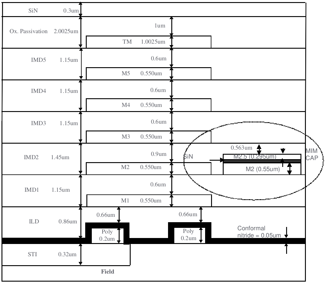 3.16 1P6M (TM 9KA with MIM) Structure¶ MIM was placed in between Metal2 and Metal3; SIN=0.042um for 1.5fF, SIN=0.062um for 1.0fF