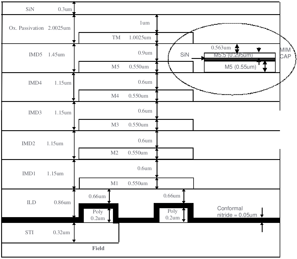 MIM was placed in between Metal5 and Metal6 (TOP Metal); SIN=0.042um for 1.5fF, SIN=0.062um for 1.0fF