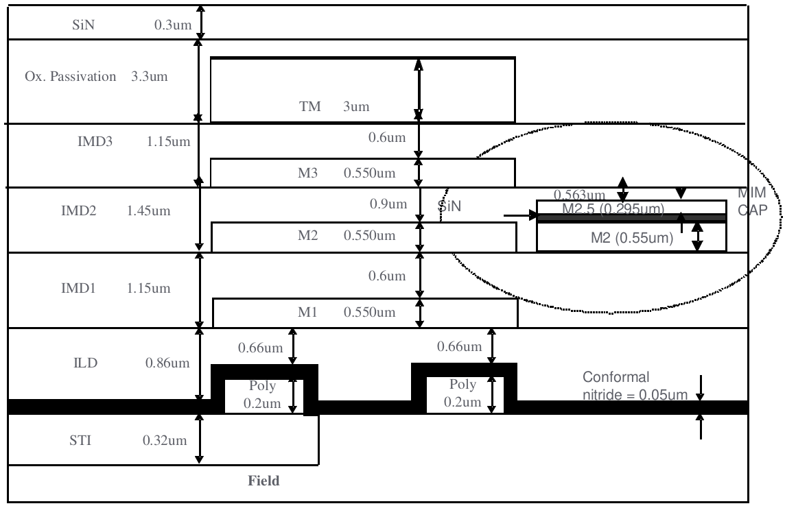 3.26 1P4M (TM 30KA with MIM) Structure¶ MIM was placed in between Metal2 and Metal3; SIN=0.042um for 1.5fF, SIN=0.062um for 1.0fF