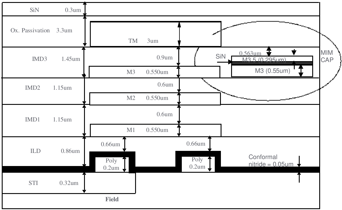 MIM was placed in between Metal3 and Metal4 (TOP Metal); SIN=0.042um for 1.5fF, SIN=0.062um for 1.0fF