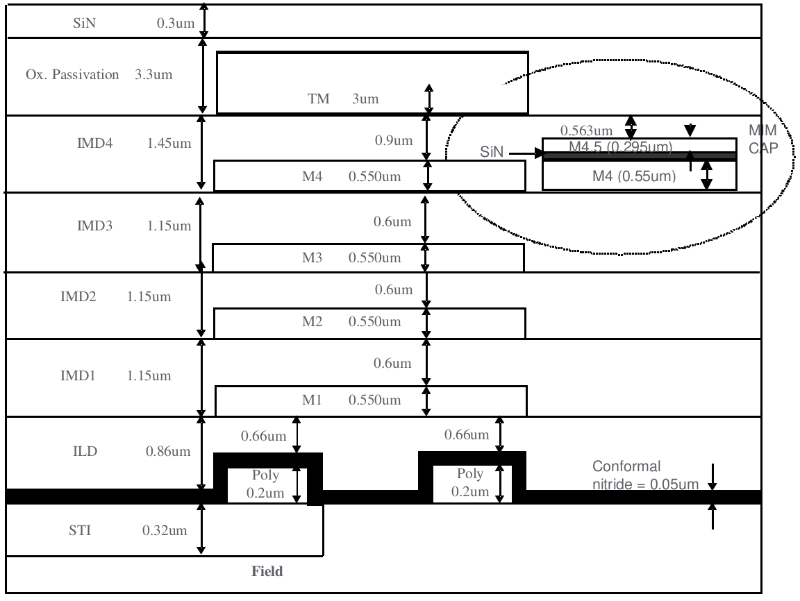 MIM was placed in between Metal4 and Metal5 (TOP Metal); SIN=0.042um for 1.5fF, SIN=0.062um for 1.0fF
