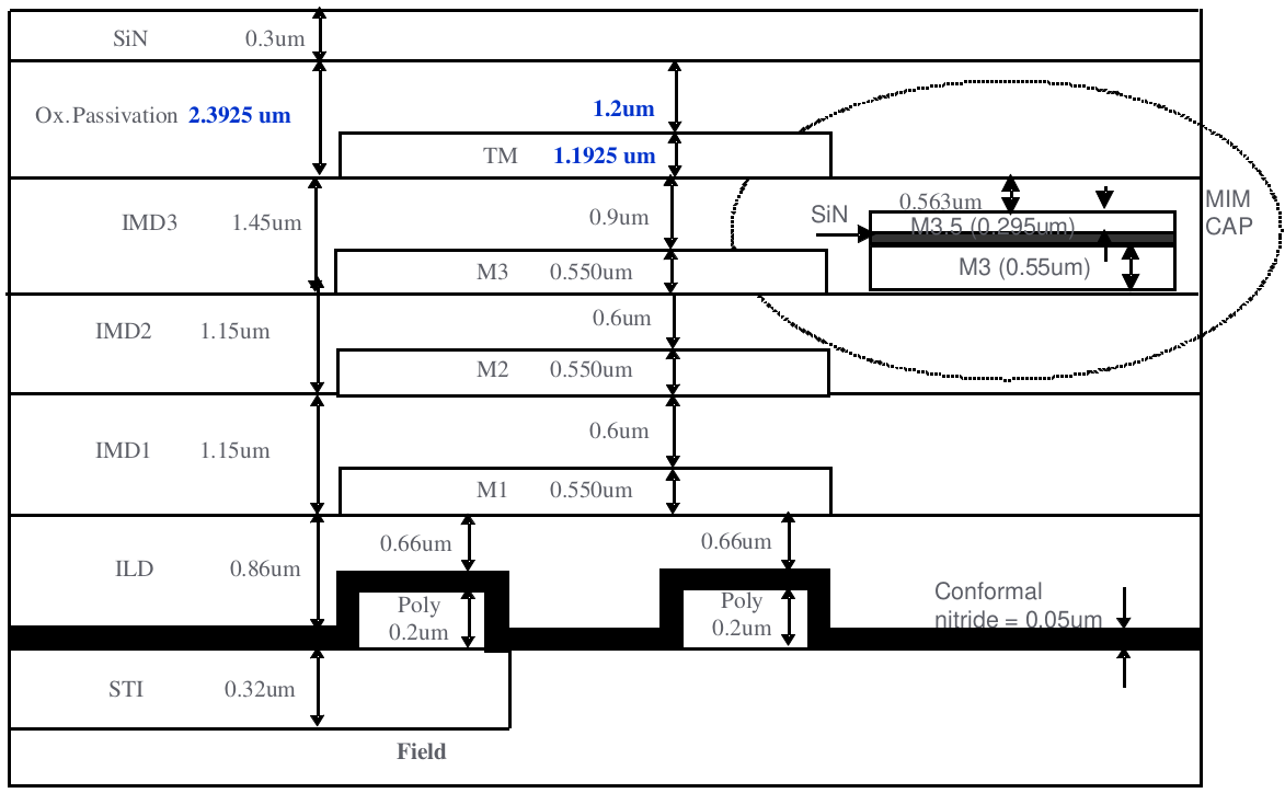 MIM was placed in between Metal3 and Metal4 (TOP Metal); SIN=0.042um for 1.5fF, SIN=0.062um for 1.0fF