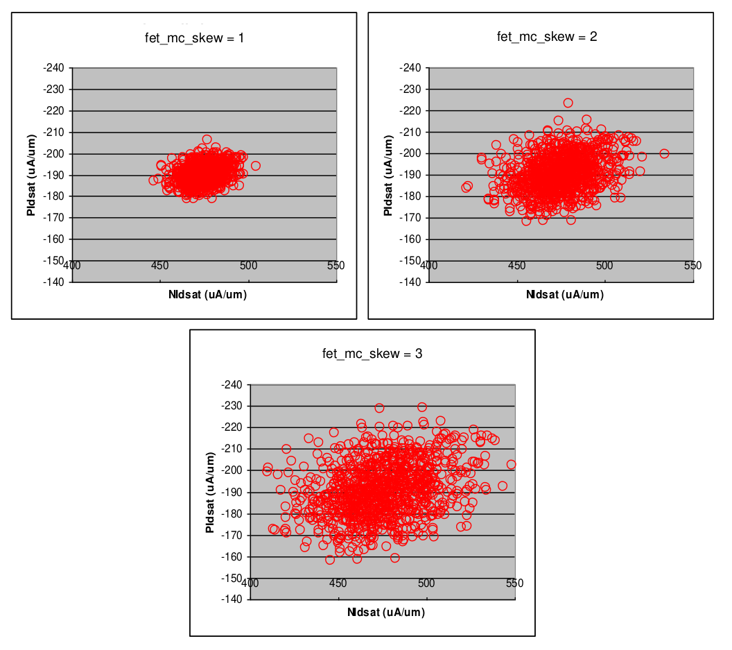 The skew parameter is used to model the tightening or loosening of manufacturing process variation. The default value of fet_mc_skew/ res_mc_skew/ cap_mc_skew is 3. Hence in the case of EP spec bound statistical (MC) models, if the actual manufacturing variation is smaller than the EP spec limit, a skew value < 3 can be used to produce a tighter Monte Carlo simulation.