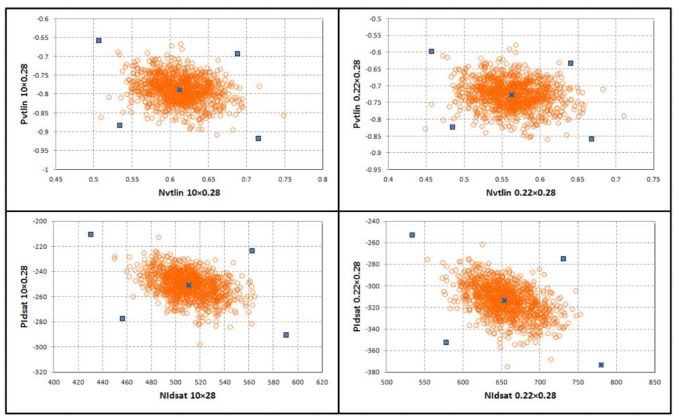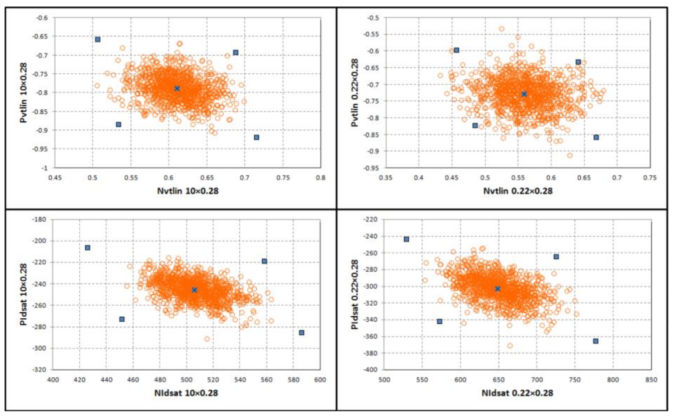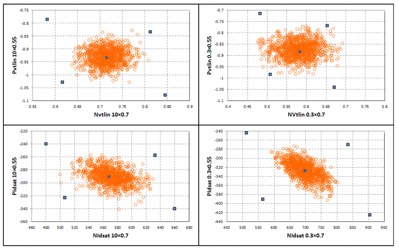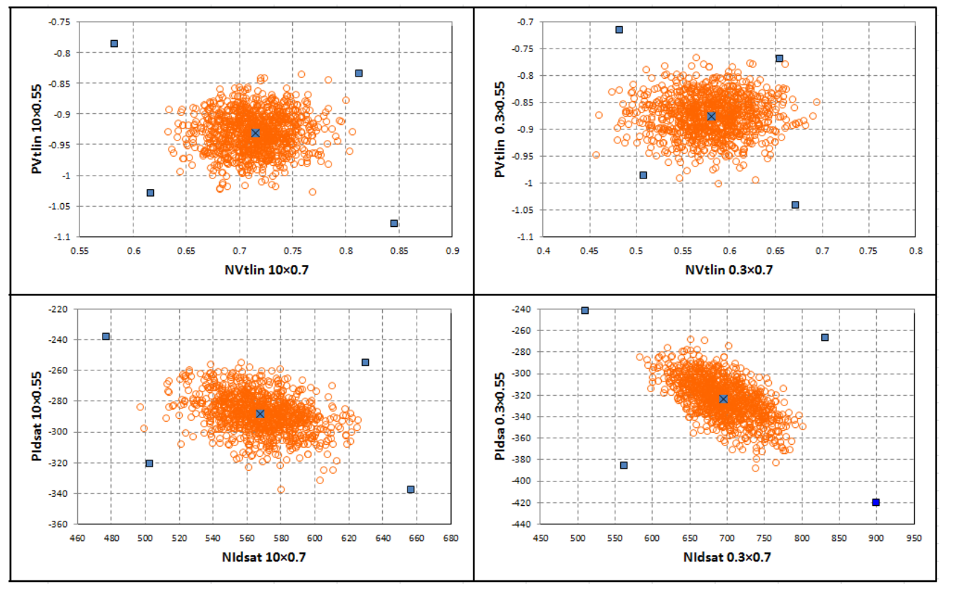 The verification plots below compare the NMOS data with the PMOS data. This plot captures 3 pieces of information: the variance of the NMOS data, the variance of the PMOS data, and the covariance of the NMOS data vs. the PMOS data.