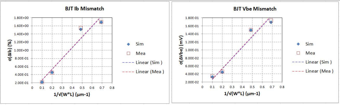 The number of runs for each model type is 1000 runs. The measurement condition for Vbe is: Vc=Vb=Vsub=GND, Ie=10uA, while for Ib it is Vc=Vb=Vsub=GND, Ve = 0.7V.