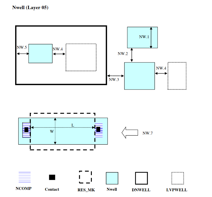 If Nwell is used as resistor, it must be covered by RES_MK (for LVS purpose). Width of the resistor determined by Nwell width. Length by COMP to COMP space. RES_MK length shall be coincide with resistor length (Touching COMP each side) and width covering the width of Nwell)”  |