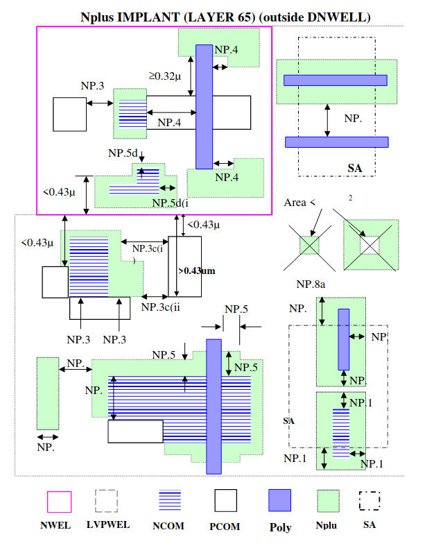 Butting Nplus and PCOMP is forbidden within 0.43μm of Nwell edge (for outside DNWELL) and of LVPWELL edge (for inside DNWELL case).  |
