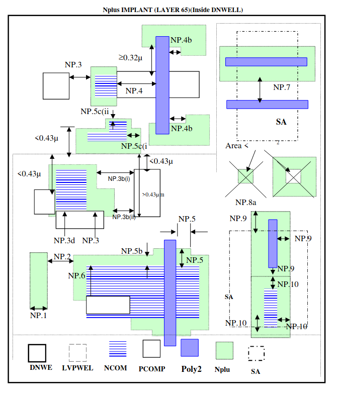 Extension beyond COMP: For Outside DNWELL, inside Nwell: I) For Nwell overlap of Nplus < 0.43μm II) For Nwell overlap of Nplus >= 0.43μm  |