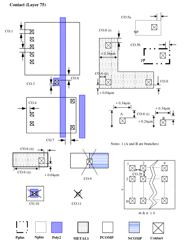 Metal1 overlap of contact I) Metal1 (< 0.34μm) end-of-line overlap (1) II) If Metal1 overlaps contact by < 0.04μm on one side, adjacent metal1 edges overlap III) Minimum Metal1 overlap of contact on all sides for minimum contact resistance variation* (guideline)  |