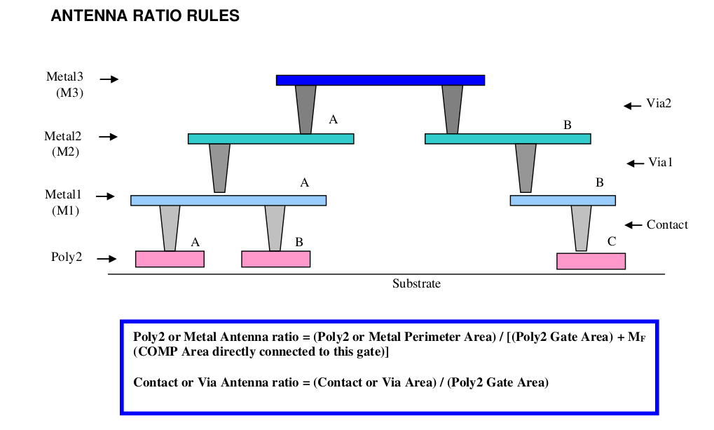 (2) Other Possible repairs if the Antenna ratio violate the design rule is break the metal close to the gate and jog the metal to an upper metal level.