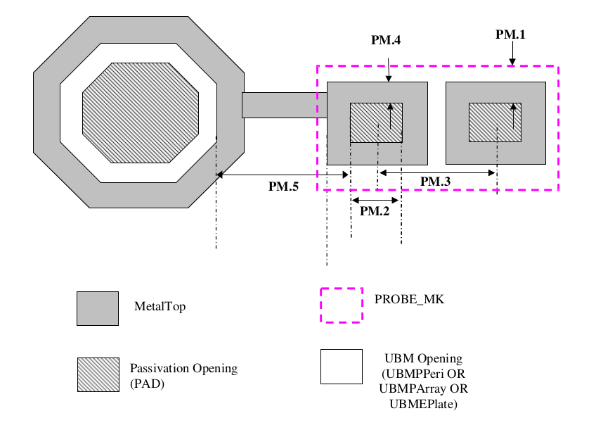 Probe pad are the wafer level test pads, which does not require solder bump on it for the packaging. Following are the design guidelines for test probe pad used together with solder bump pad. Probe pads are identified by the PAD layers covered by PROBE_MK layers.