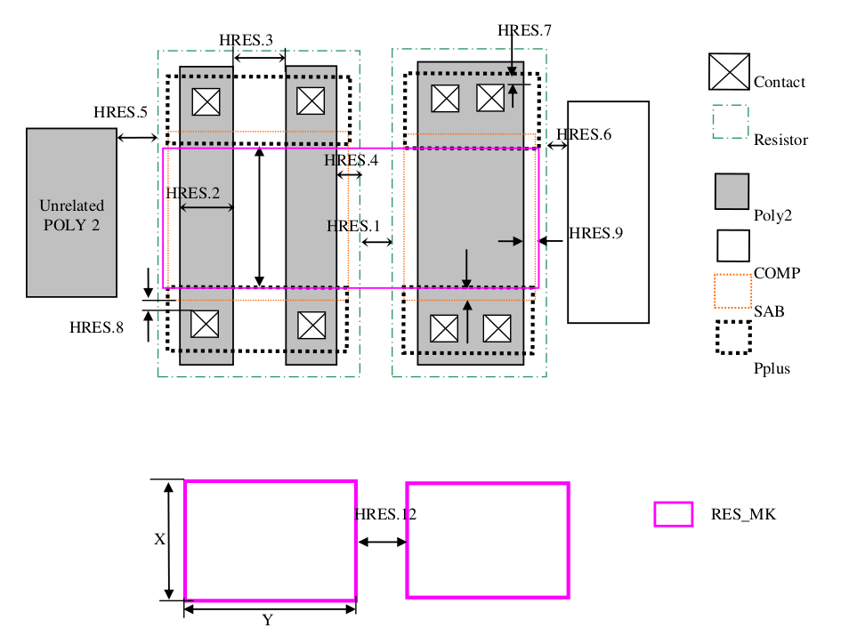 P type Poly2 resistor (high sheet rho) shall be covered by RES_MK marking. RES_MK length shall be coincide with resistor length (Defined by Pplus space) and width covering the width of Poly2. If the size of single RES_MK mark layer is greater than 15000um2 and both side (X and Y) are greater than 80um. Then the minimum spacing to adjacent RES_MK layer  |