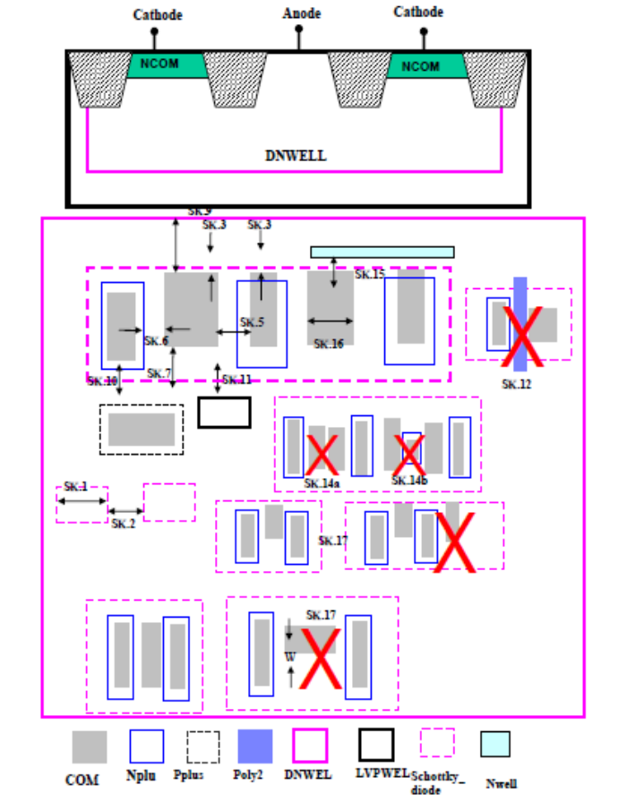 This section describes the schottky diode for this process. Schottky diode is formed by Co-salicidation and N-type silicon inside DNWELL. Its anode is the COMP under Schottky_diode marking but without Nplus. Its cathode is the NCOMP covered by Schottky_diode marking. Schottky_diode layer can exist both in LV or MV area.