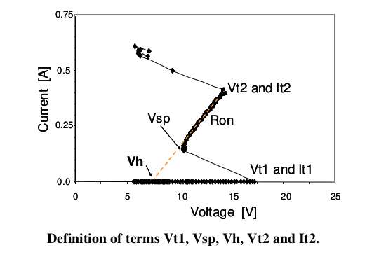 Accurate determination of the lowest voltage across the device after the device is turned-on is critical to ensure that device do not enter latch-up conditions (assuming that current level at Vsp is less than latch-up current requirements).